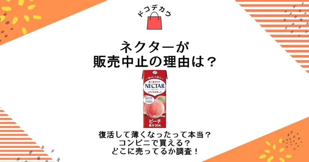 不二家から発売され、トロッとした独特の口当たりで人気のネクター 50年以上販売されているロングセラー商品で、ネクターのファンだという方も多いのではないでしょうか? そんな人気のネクターですが、販売中止になっているという噂が流れています。 そ... -